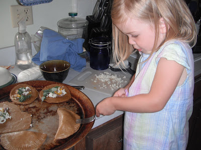 keep my hands to myself. Here she is making calzones with whatever we could find leftover in the fridge: rye bread dough, spinach from our garden (oh, need to get pictures of that up too!), mozzarella, chopped up steak, other stuff. Why rye bread dough? I have been trying out various rye bread recipes in pursuit of the most delicious rye bread I can make. No one else seems to like rye bread, but I do, and so does my Oma, so there. :)